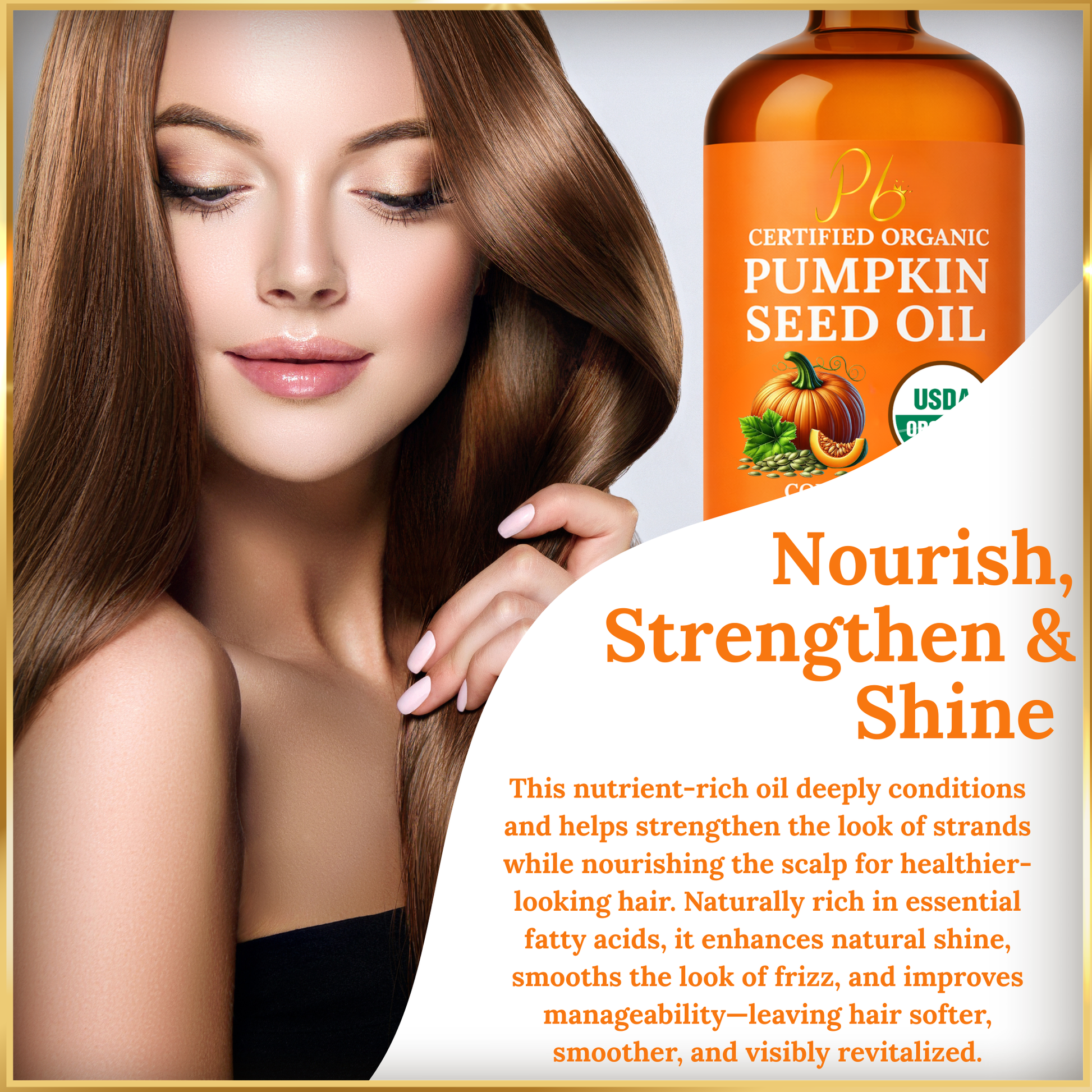 In hair care routines, pumpkin seed oil is commonly applied to help soften the look of dry strands, improve manageability, and add natural-looking shine without feeling heavy. It can be used daily, as a finishing oil, or as part of a weekly hair mask routine.
